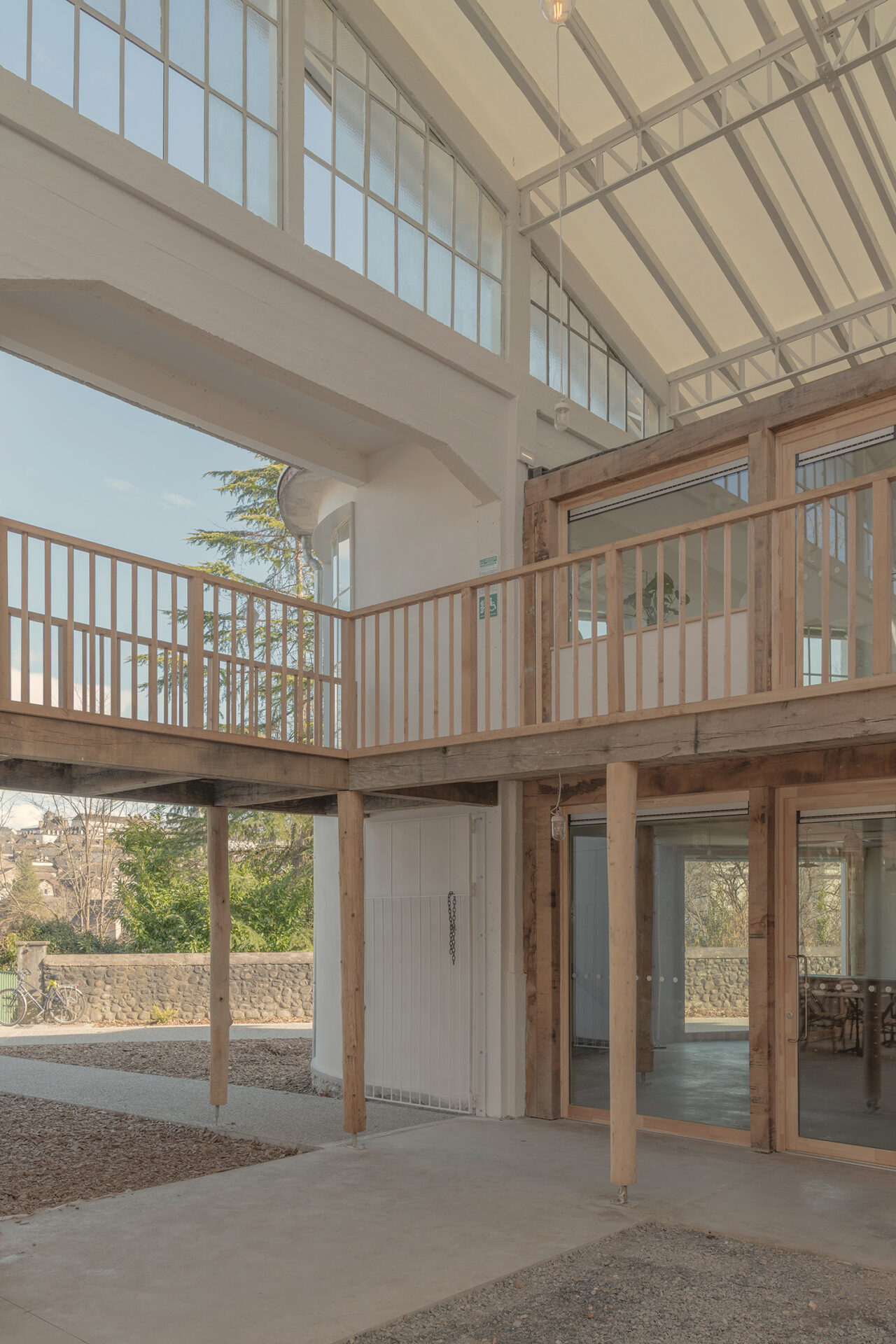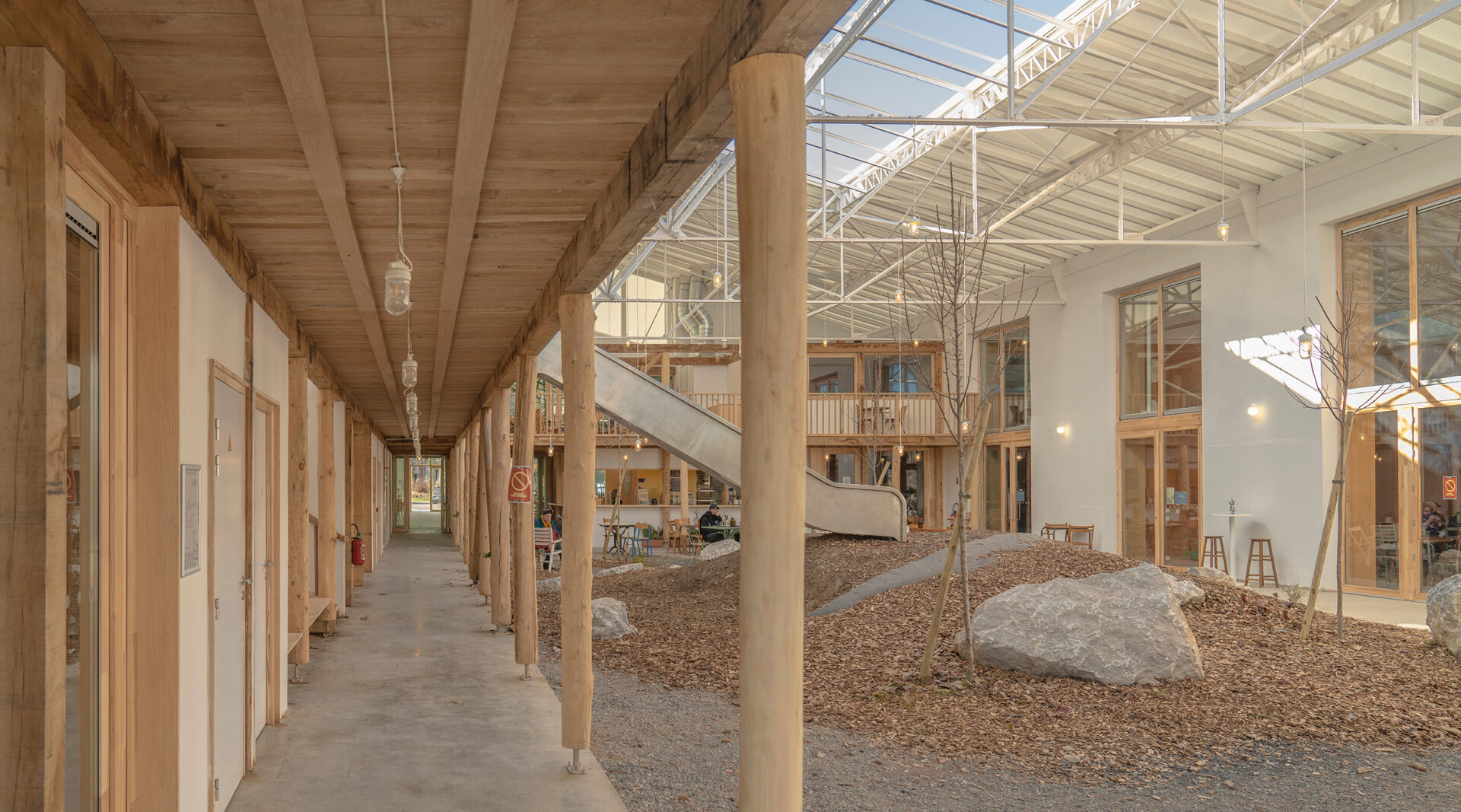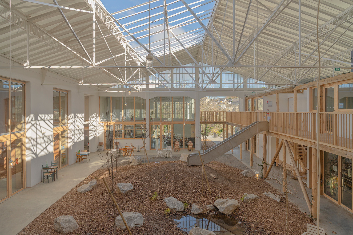 La transformation de la grande halle repose sur un parti pris fort : ouvrir la toiture pour créer un espace hybride entre intérieur et extérieur.
